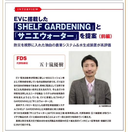 オフグリッド型栽培システムとHEV車との組み合わせた農業と防災の在り方について特集を組んでいただき、前編後編に編集いただきました。